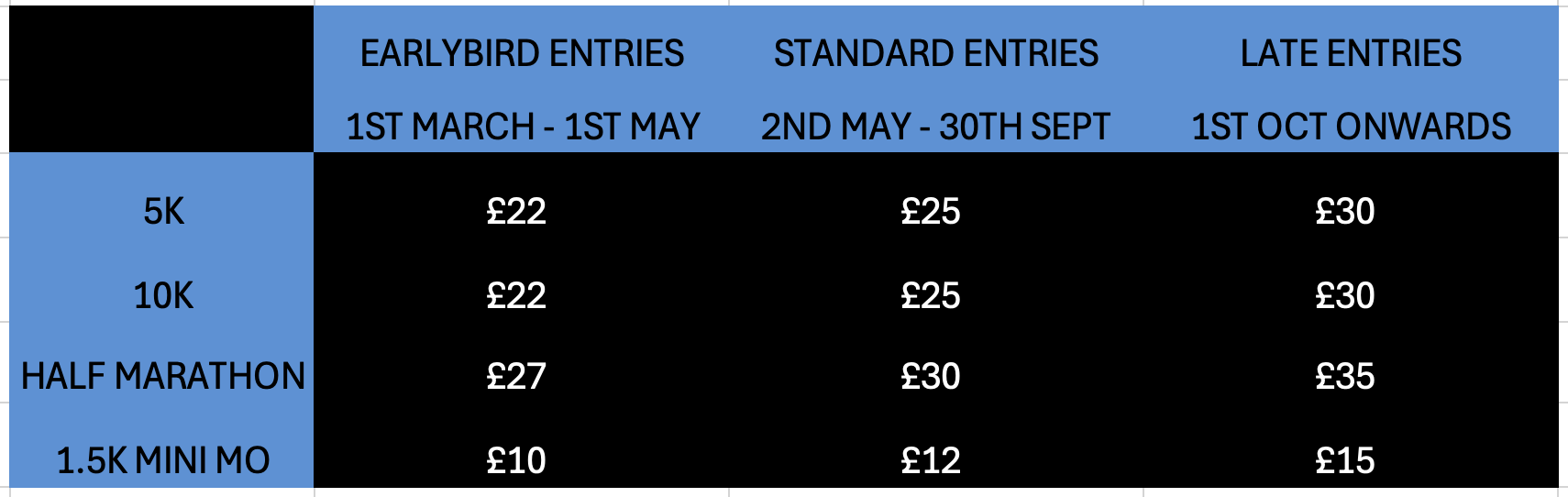 Unless the event sells out, we typically close online entries 5-7 days ahead of event day. We generally have on the day entries available but do check with us first as it can be park dependant. On the day entries are allocated on a first come, first served basis. To secure a place aim to be with us at least 45-60 minutes ahead of the first race starting. Please come to the On The Day Registration gazebo and we will get you signed up there. It is typically £30 for the 5k/10k and £35 for the half marathon cash or card on the day.
